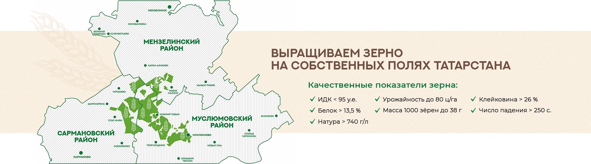 Выращиваем зерно высочайшего качества на собственных землях общей площадью 17510 га в экологически чистых районах Республики Татарстан. Продукция Агрофирмы преимущественно направлена на удовлетворение потребностей ведущего хлебзавода Татарстана «ЧЕЛНЫ-ХЛЕБ», обеспечивая сырьевую базу собственного производства.