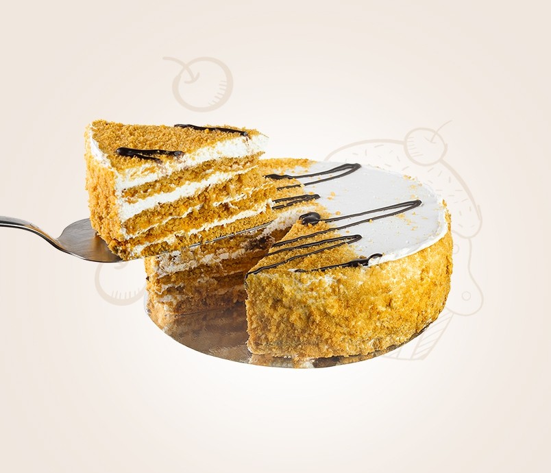 Мука пшеничная хлебопекарная в/с, мед натуральный, маргарин (рафинированные дезодорированные масла в натуральном и модифицированном виде (пальмовое масло и его фракции, подсолнечное масло), вода питьевая, эмульгаторы: Е471, Е322; соль пищевая, краситель: Е160а, ароматизатор, регулятор кислотности: кислота лимонная), сахар белый, меланж яичный, крем на растительных маслах для взбивания (вода питьевая, заменитель масла-какао нетемперируемый лауринового типа (рафинированное, дезодорированное пальмоядровое масло в натуральном и модифицированном виде, эмульгатор Е322), глюкозный сироп, глюкоза кристаллическая, комлексная пищевая добавка (стабилизаторы : Е481, Е464, Е466; агент антислеживающий Е460i, эмульгатор: Е475, антиокислители: Е386, Е304i), эмульгатор Е435, регулятор кислотности Е331iii, соль пищевая, комлексная пищевая добавка (подсластители: Е952, Е954), ароматизатор); начинка кондитерская «Сгущенка»(сахар белый, молоко обезжиренное, сыворотка молочная сухая, заменитель молочного жира (рафинированные, дезодорированные растительные масла в натуральном и модифицированном виде: пальмовое и его фракции, подсолнечное; антиокислитель- концентрат смеси токоферолов), мальтодекстрин, стабилизатор (Е1442, каррагинан), ароматизатор пищевой (масло сладкосливочное, концентрат сывороточного белка, ароматизатор пищевой «Сливки», ароматизатор пищевой натуральный «Сливочное масло», стабилизатор Е415, эмульгатор Е476, консервант Е202), лактоза), вода питьевая, разрыхлитель: гидрокарбонат натрия, молоко питьевое (молоко цельное, молоко обезжиренное), кондитерская глазурь (сахар белый, заменитель какао-масла: гидрогенизированная пальмовая фракция, антиокислитель: Е306; какао-порошок, эмульгаторы: Е322, Е476; ароматизатор «Ванилин»), сметана 20% (сливки, закваска молочнокислых микроорганизмов), сухая смесь для приготовления крема со вкусом «Сметана» (пудра сахарная, крахмал кукурузный, загустители Е415, Е401; молоко сухое обезжиренное, регулятор кислотности: кислота лимонная, сметанный порошок, ароматизаторы «Ванилин», «Сливки»), пищевой концентрат (сахар белый, желирующий агент: желатин), крахмал картофельный, желток яичный жидкий пастеризованный, консервант: кислота сорбиновая, ароматизатор «Ванилин». соль пищевая, загустители: Е412,Е 415.