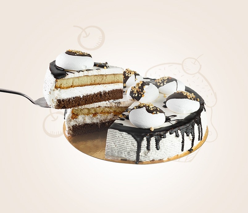 Сахар белый, меланж, мука пшеничная хлебопекарная в/с, крем на растительных маслах для взбивания (вода питьевая, заменитель масла-какао лауринового типа (рафинированное, дезодорированное пальмоядровое масло в натуральном и модифицированном виде, эмульгатор Е332), глюкозный сироп, глюкоза кристаллическая, комлексная пищевая добавка (эмульгаторы: Е471, Е475, стабилизаторы: Е481, Е464), агент антислеживающий Е460i, загустители: Е466, Е412, регуляторы кислотности: Е339, Е331; антиокислители: Е385, Е304 ), эмульгатор Е435, соевый лецитин; подсластители: Е952, Е954, ароматизатор), консервы молокосодержащие с заменителем молочного жира (сахар белый, молоко обезжиренное, молоко сухое цельное, заменитель молочного жира(рафинированные дезодорированные растительные масла в натуральном и модифицированном виде: пальмовое и его фракции, подсолнечное, соевое, рапсовое, антиокислитель-концентрат смеси токоферолов); загуститель: мальтодекстрин; стабилизаторы: крахмал кукурузный, каррагинан; ароматизаторы: «Масло сладко-сливочное», «Сливки», концентрат сывороточного белка; ароматизатор натуральный «Сливочное масло»; стабилизатор: ксантановая камедь, консервант: сорбат калия; лактоза), масло сливочное (сливки пастеризованные), посыпка кондитерская «Соломка» (эквивалент какао-масла: пальмоядровое, сахар белый, какао-порошок, ароматизатор «Ванилин», эмульгаторы: Е476, Е322), маргарин для кремов (рафинированные дезодорированные растительные масла: подсолнечное, пальмовое, пальмоядровое; вода питьевая, эмульгаторы: Е475, Е472, Е322; ароматизатор «Масло», регулятор кислотности: кислота лимонная, краситель Е160а, консервант: сорбат калия), глазурь кондитерская (заменитель какао-масла лауринового типа: пальмовое масло, сахар белый, какао-порошок, эмульгатор: лецитин, ароматизатор «Ванилин»), какао-порошок, эмульгаторы: Е471, Е476, Е477; влагоудерживающий агент: сорбитол, белок яичный сухой, вино столовое (виноград, консерванты: Е200, Е220), загуститель: агар, регулятор кислотности: кислота лимонная, консервант: кислота сорбиновая, разрыхлитель: гидрокарбонат натрия, ароматизаторы «Ром», «Ванилин», «Пломбир».